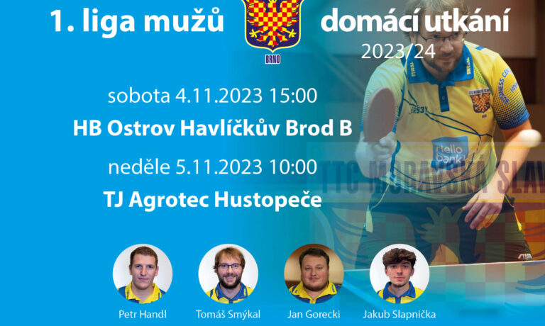 Sobota 4. 11. 2023 v 15:00 hod. – 1. liga mužů: MS A – Havlíčkův Brod B Neděle 5. 11. 2023 v 10:00 hod. – 1 liga mužů: MS A – Hustopeče